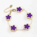 Make a majestic statement with the Royal Amethyst Clover Bracelet, where elegance meets bold expression. Featuring five deep purple enamel clovers surrounded by a halo of shimmering crystals, this piece evokes royalty, mystery, and elevated style.